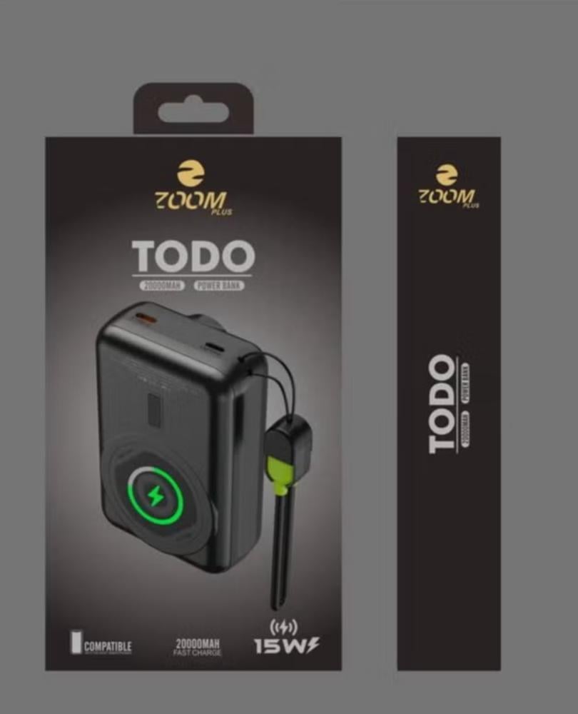 بنك طاقة TODO ZP555 بسعة 20000 مللي أمبير/ساعة، متوافق مع ماج سيف، شحن لاسلكي، جاذبية مغناطيسية، شاشة LCD، تصميم صغير الحجم مع كابل Type-C وLightining مدمج (أسود)